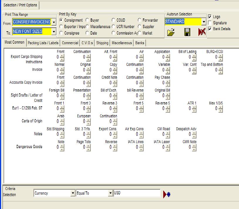 You can then choose to print by the key required, and insert parameters into the bottom portion of the screen. The addition was made for a customer using Formwise as a print engine for all invoice, both home and export, and he wanted to print home invoices where the date was as specified and the country code equal to "GB". This option allows that functionality.