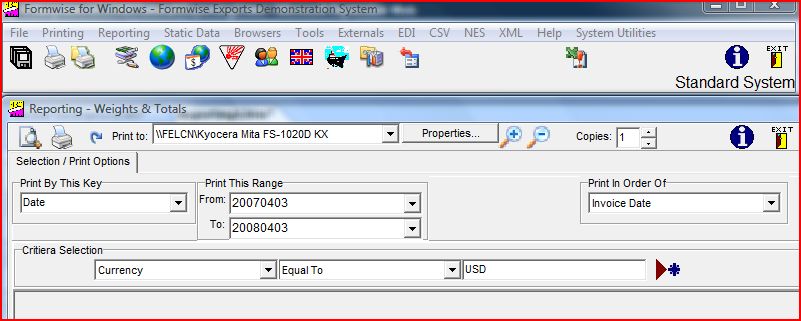 In terms of the order in which consignments are printed, this is affected by the choice of "Print in Order of:", such that we could ask for a list of all consignments, but only where a certain forwarder key was stored. In this situation the system would look at each consignment in key order, checking whether the criteria was met, and thus all records would be read. If however we chose to print by forwarder key, then as the file is already indexed then only the appropriate records would need to be read, thus giving a