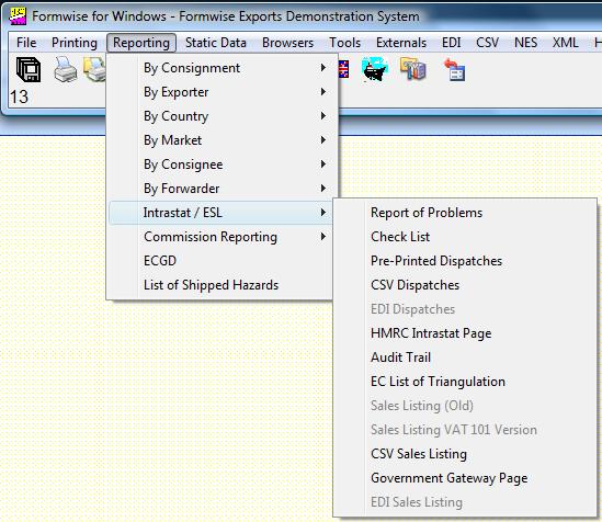 1 CSV Dispatches and Upload: This CSV extracts the necessary data extracted to a file. This file can then be used to upload on to the Customs web-site via the HMCE Intrastat page option. There is an option though to print the resulting submission from the Customs web-site.