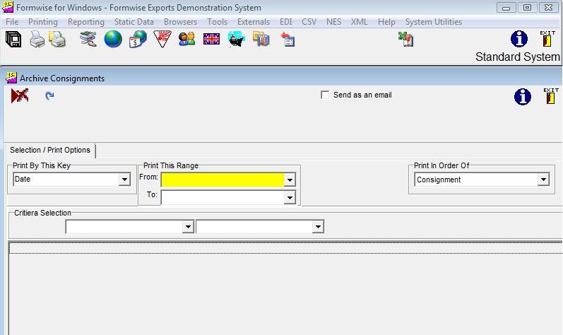 If you use the system to create Quotations and would like to archive some of them, they would be ignored by the above routine as they have no invoice date. However by changing "Print by range" by clicking into consignment, and selecting either :-