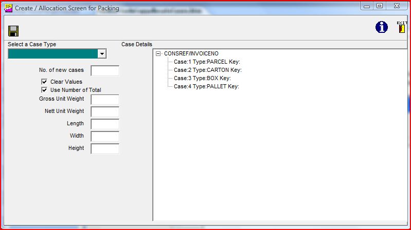Before using this option you should understand the entry of data into the Case Allocation Tab on the Browse/Amend Consignments option, as this routine allows you to enter a pack with its sizes, weights and product allocation, and create the entered number of records.