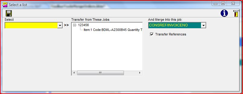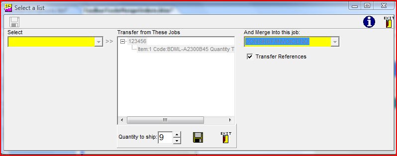 then have the option to amend the quantity to be shipped, and clicking on the Save or Exit buttons. Having selected the consignment into which the items are to be merged, click on the "Accept" icon to perform the merge. The system records the number of items merged in this manner, so the quantity available is the remaining number if items have already been merged from this "order" consignment.