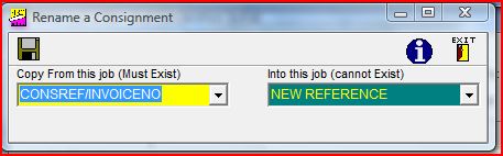 This option was added in order to correct a possible typing error in the consignment reference. Having selected this option, you will be asked to insert / select the reference of the consignment whose key is to be changed, and then to type in the new reference in the "Into this job (cannot Exist)" box.